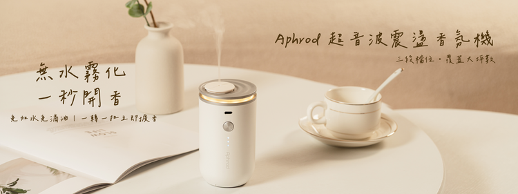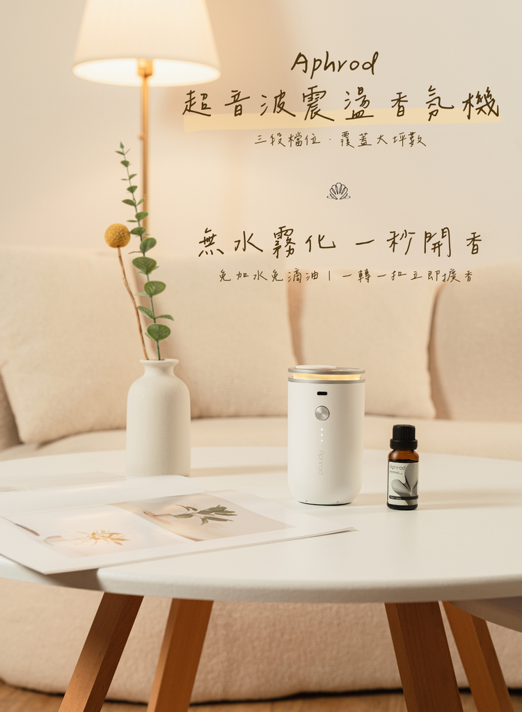 Aphrod 超音波香氛機與天然精油,靜音設計、擴香迅速、持久留香。多種香氛選擇,適合家居、辦公、車載與 SPA,提升生活品質。